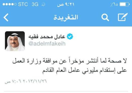 وجاء ذلك عبرتغريدة ارسلهاالمهندس عادل فقيه بحسابهالرسمي في شبكة التواصل الإجتماعي”تويتر”، وكان عدد من وسائل الإعلام تناقل في الأيام الماضية أخباراً عن نية وزارة العمل، استقدام مليوني عامل، العام المقبل، لتعويض العمالة المخالفة.