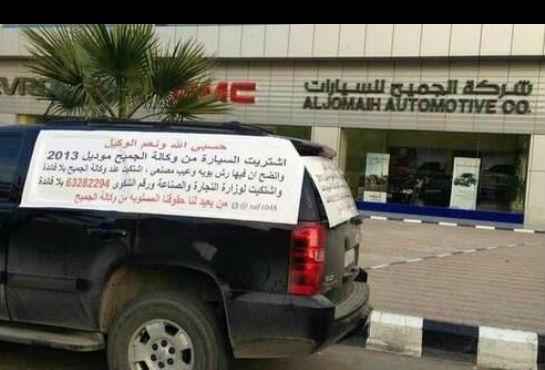 جاء ذلك بعد تداول صور سيارتي مواطنين وضعا عليها إعلانات اشتكوا فيها من تعرضهم للاحتيال مشيرين الى أنهما اشتريا سيارتين جديدة من الجميح وموديلاتها ٢٠١٢ ، ٢٠١٣ واكتشفت بأنها تعرضت لعمليات إصلاح تمثل في رش بويه وعيب مصنعي وأنهما قدما شكاوى لوزارة التجارة لكن شكاويهم لم تجد البت من الوزارة على حد زعمهم.