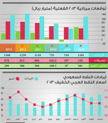 وتوقع أن يصل اجمالي ايرادات الميزانية النفطية وغير النفطية 1.16 تريليون ريال أي بفائض قدره 290 مليار ريال وذلك باقل من فائض 2012 بمقدار 96 مليار ريال نتيجه لتراجع أسعار النفط العربي الخفيف الى متوسط 108.4 دولارات للبرميل وليس نتيجة لانخفاض الانتاج الذي من المتوقع ان يبلغ متوسطه 9.58 ملايين برميل يوميا، حيث بلغ متوسط الصادرات النفطية 7.26 ملايين برميل يوميا.