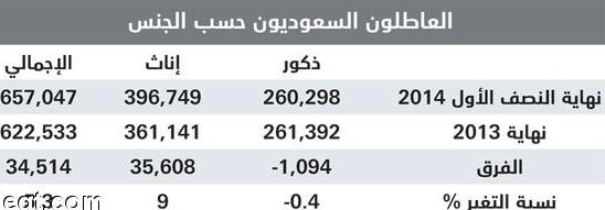 أما العاطلون السعوديون في نهاية النصف الأول 2014، فبلغوا 657 ألف نسمة، 40 في المائة منهم ذكور بعدد 260.3 ألف نسمة، و60 في المائة إناث بنحو 396.7 ألف نسمة. فيما كان عدد العاطلين السعوديين الذكور 261.4 ألف في نهاية 2013، فيما الإناث العاطلات كن 361.1 ألف، وبالتالي فعدد العاطلات السعوديات ارتفع بنسبة 9 في المائة، فيما عدد الذكور تراجع بنسبة 0.4 في المائة، وهو ما انعكس على تحسن بطالة الذكور مقابل ارتفاعها لدى الإناث السعوديات.