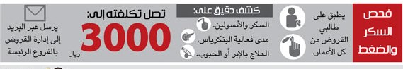 ويتراوح سعر الفحص الطبي السري ما بين 2500 إلى 3 آلاف ريال ويسلم عبر البريد للبنك في إدارة القروض بالفروع الرئيسية كجزء من دراسة الحالة الصحية والمعيشية للمستفيد، ويشترط البنك أن يكشف بشكل دقيق عن السكر ونسبة الأنسولين وهل المستفيد يتعالج عن طريق الإبر أو الحبوب ومدى فعالية البنكرياس.