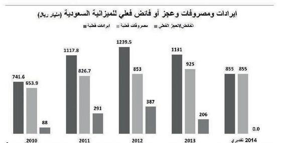 ويعني ذلك أنه من المتوقع أن تحقق السعودية إيرادات نفطية خلال العام الجاري قدرها تريليون ريال، تضاف إليها إيرادات غير نفطية متوقعة بنحو 100 مليار ريال، ليصل إجمالي إيرادات الميزانية خلال 2014، نحو 1.1 تريليون ريال، بفائض قدره 147 مليار ريال (39 مليار دولار) عن الإيرادات التي قدرتها الدولة في ميزانية 2014، فيما سيتحدد الفائض الفعلي وفقا للمصروفات الفعلية التي تنفقها الدولة خلال العام، التي كانت قد قدرتها بـ 855 مليار ريال أيضا كالإيرادات، إلا أنه عادة ما تنفق الدولة فعليا أكثر مما تقوم بتقديره.