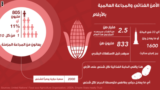 805 مليوناً: هو عدد الأشخاص الذين يعانون من الجوع الشدي، ورغم أن هذا الرقم تناقص بنسبة 11 في المائة خلال العقد الماضي، إلا أنه يشكل نسبة غير مقبولة من عدد سكان العالم.