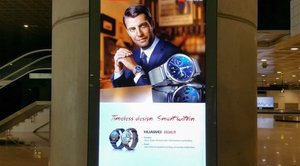 ووضعت هواوي إعلانا يستقبل زوار المعرض بمطار برشلونة الدولي، رصده أولاً موقع “أندرويد سنترال” Android Central، لساعة ذكية تحمل اسم “هواوي ووتش” Huawei Watch.