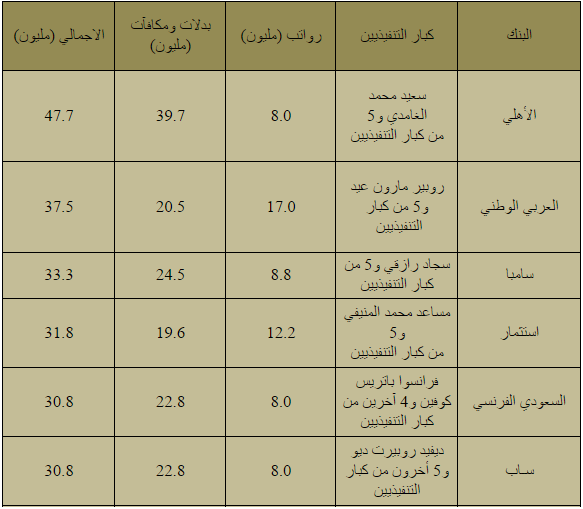 وبالرغم من أن بنك الرياض ومصرف الراجحي يعدان من أكبر البنوك في القطاع من حيث رأس المال الا أن المبالغ التي يحصل عليها كبار التنفيذيين في البنكين جاءت الأقل في القطاع بـ 20 مليون ريال و 16.3 مليون ريال على الترتيب.