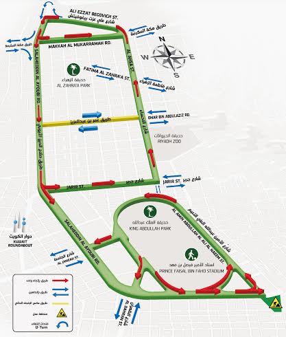 وأخيراً ستقتصر الحركة في شارع الظهران على اتجاه واحد نحو الغرب في الجزء الواقع منه بين إستاد الأمير فيصل بن فهد وطريق صلاح الدين الأيوبي.