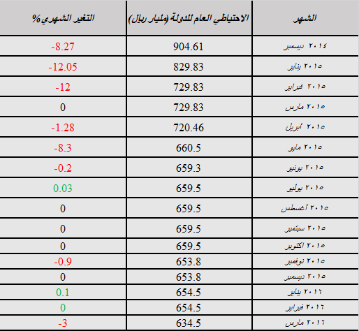 كان الاحتياطي العام سجل ارتفاع بـ 600 مليون ريال خلال شهر يناير مقارنة بشهر ديسمبر 2015، وهي المرة الأولى في 6 أشهر وتحديداً منذ يوليو العام الماضي حينما سجل ارتفاع طفيف بـ 200 مليون ريال، مقارنة بالشهر الذي سابقه. وسحبت الحكومة السعودية خلال العام الماضي من الاحتياطي العام ما مجموعه 251 مليار ريال، حتى شهر نوفمبر الماضي قبل أن يشهد الاحتياطي استقرار في شهر ديسمبر ومن ثم الارتفاع في يناير الماضيين، والاستقرار في فبراير قبل أن يتراجع في مارس.