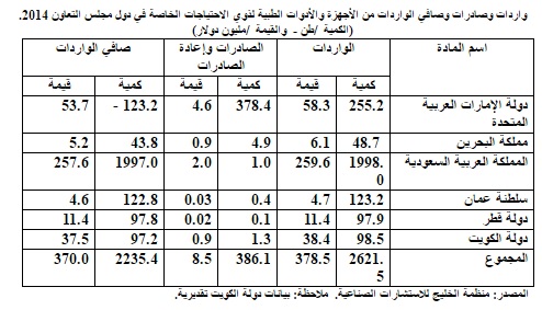 والجدول التالي يوضح واردات وصادرات وصافي الواردات من الأجهزة والأدوات الطبية لذوي الاحتياجات الخاصة في دول مجلس التعاون 2014.