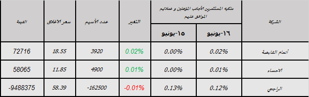 من جهة أخرى تم تسجيل دخول المستثمرين الأجانب المؤهلين وعملائهم الموافق عليهم في شركتي أنعام القابضة والاحساء وأصبحت ملكيتهم 0.02% و0.01% في الشركتين على الترتيب بعد أن كانو لايمتلكون فيهما خلال الجلسة السابقة.