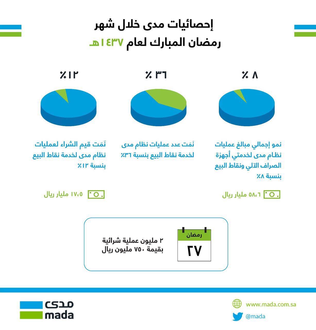 ووفقاً للاحصاءات فقد تمت إنجاز عدد 49 مليون عملية شرائية من خلال نظام مدى لخدمة نقاط البيع لشهر رمضان المبارك ، منها 10 مليون عملية نقاط بيع خلال الشهر الفضيل على 4 قطاعات رئيسية، بلغت قيمتها الاجمالية 3.36 مليار ريال، توزعت على الذهب والمجوهرات 1.5 مليار ريال، والاغذية والتموينات 1.4 مليار ريال، والسفر والسياحة 415 مليون ريال، والأثاث والمفروشات 13 مليون ريال.