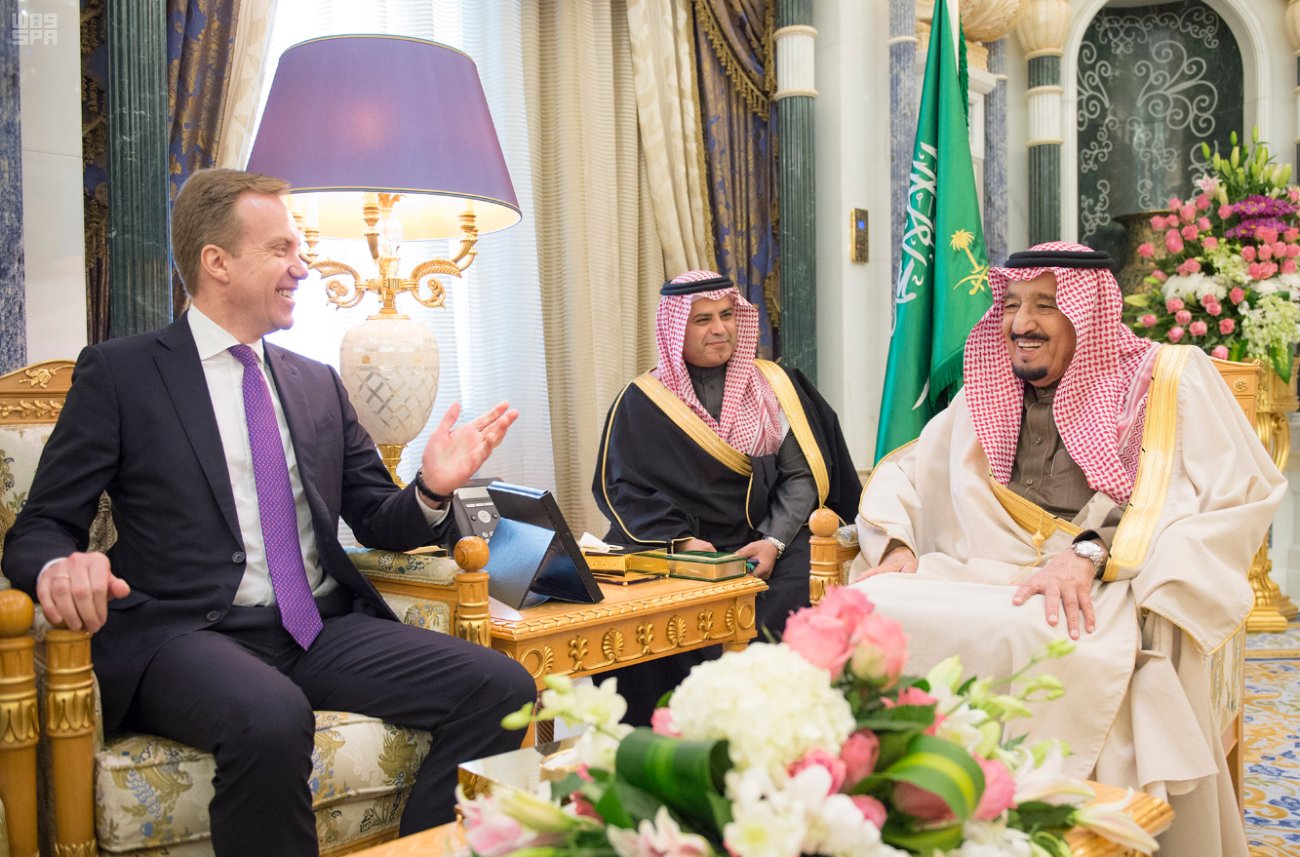 استقبل خادم الحرمين الشريفين الملك سلمان بن عبدالعزيز، في مكتبه بقصر اليمامة في الرياض اليوم، وزير الخارجية بمملكة النرويج بورغ برنده.