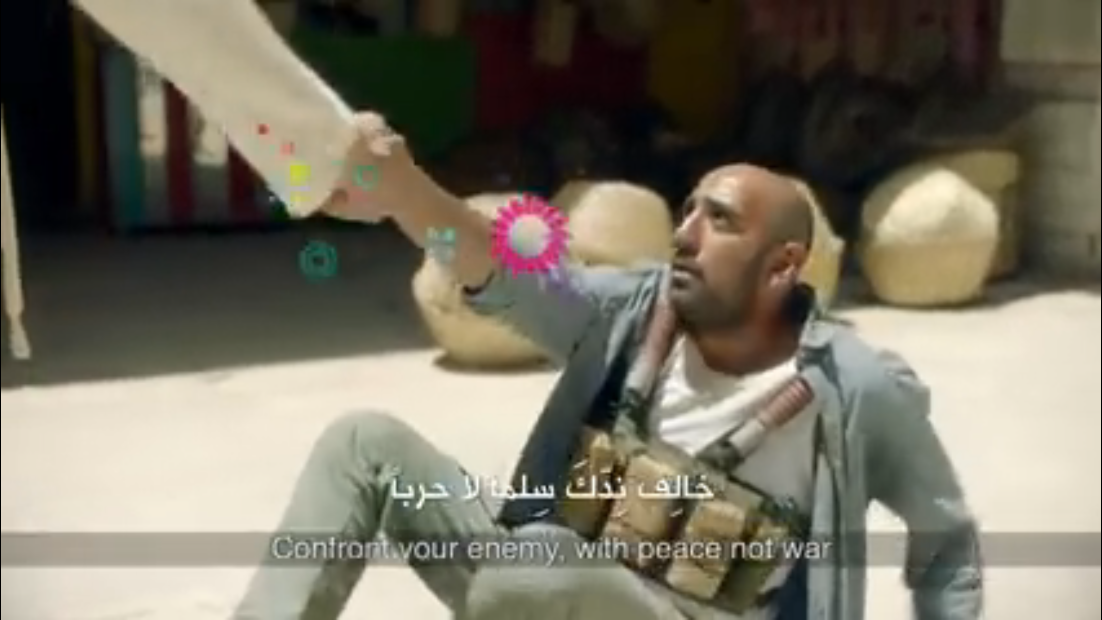 يجسد الاعلان الارهابي وهو يحمل الحزام الناسف ويصعد باص به ابرياء بينهم رجل مسن يحمل طفل يناشد الارهابي قائلا “أشهد أن لا إله إلا الله .. يا قادما بالموت وهو خالق الحياة” ثم تأتي صورة الارهابي وهو يردد “اشهد أن محمداً عبده ورسول الله” ويجلس مواجها للطفل السوري الحلبي عمران دقنيش الذي هزت صوره العالم، بعدما أخرجته فرق الإنقاذ من تحت أنقاض بيته، جراء قصف طيران نظام بشار الأسد وسلاح الجو الروسي، ليرد الطفل على الانتحاري قائلا له “مسامحاً حليم لم يؤذ من أذاه” ويقصد الرسول الكريم محمد صلى الله عليه وسلم.