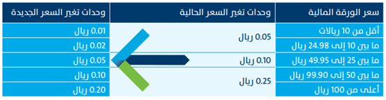 وذلك بعد ان كانت وحدة تغير السعر لجميع الأسهم المدرجة في السوق كانت قبل تاريخ 13 سبتمبر 2008 تبلغ 25 هللة بغض النظر عن سعر تداول السهم.
