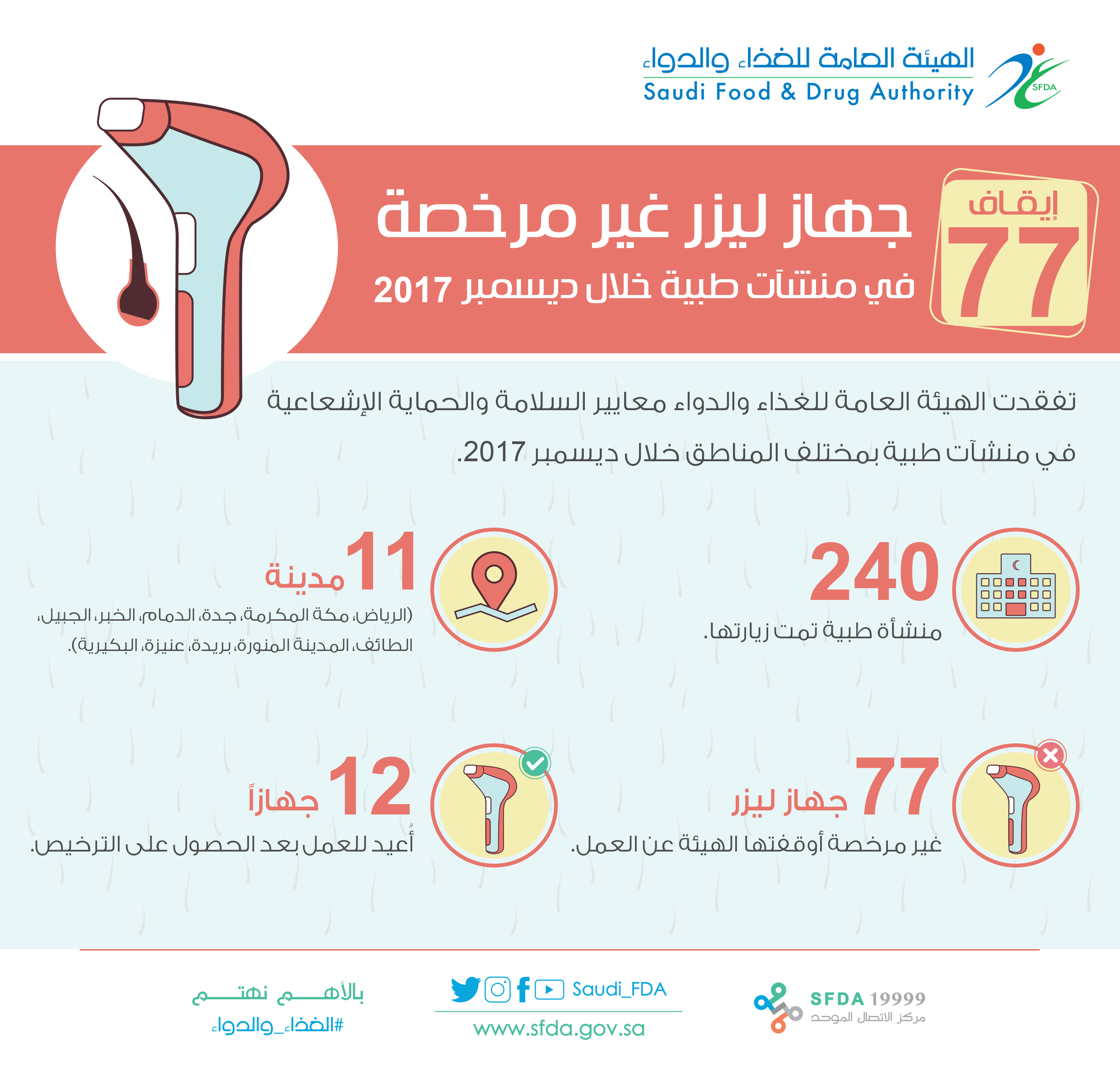 وأكدت إيقاف العمل على 77 جهاز ليزر غير مرخصة من الهيئة (عدم الحصول على شهادة الإذن بالتسويق)، وجرى لاحقاً إعادة العمل على 12 جهازاً منها، بعد استيفائها متطلبات الهيئة والحصول على الترخيص اللازم.