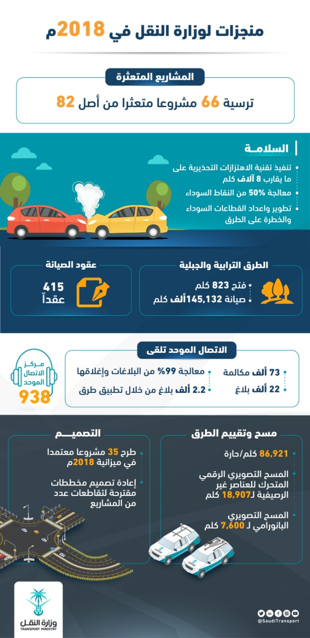 شرعت وزارة النقل في معالجة المشاريع المتعثرة خلال 2018، حيث أعادت 80% من تلك المشاريع إلى المسار الصحيح من أجل إنجازها، متوقعة الانتهاء منها خلال عامي 2019 – 2020م، مشيرة إلى أنها أعادت ترسية 66 مشروعا متعثرا من أصل 82 مشروعا، مما يسهم في الارتقاء بجودة الطرق ورفع مستوى السلامة عليها وتقليل نسبة الحوادث وحجم الخسائر الاقتصادية والاجتماعية التي تسببها.