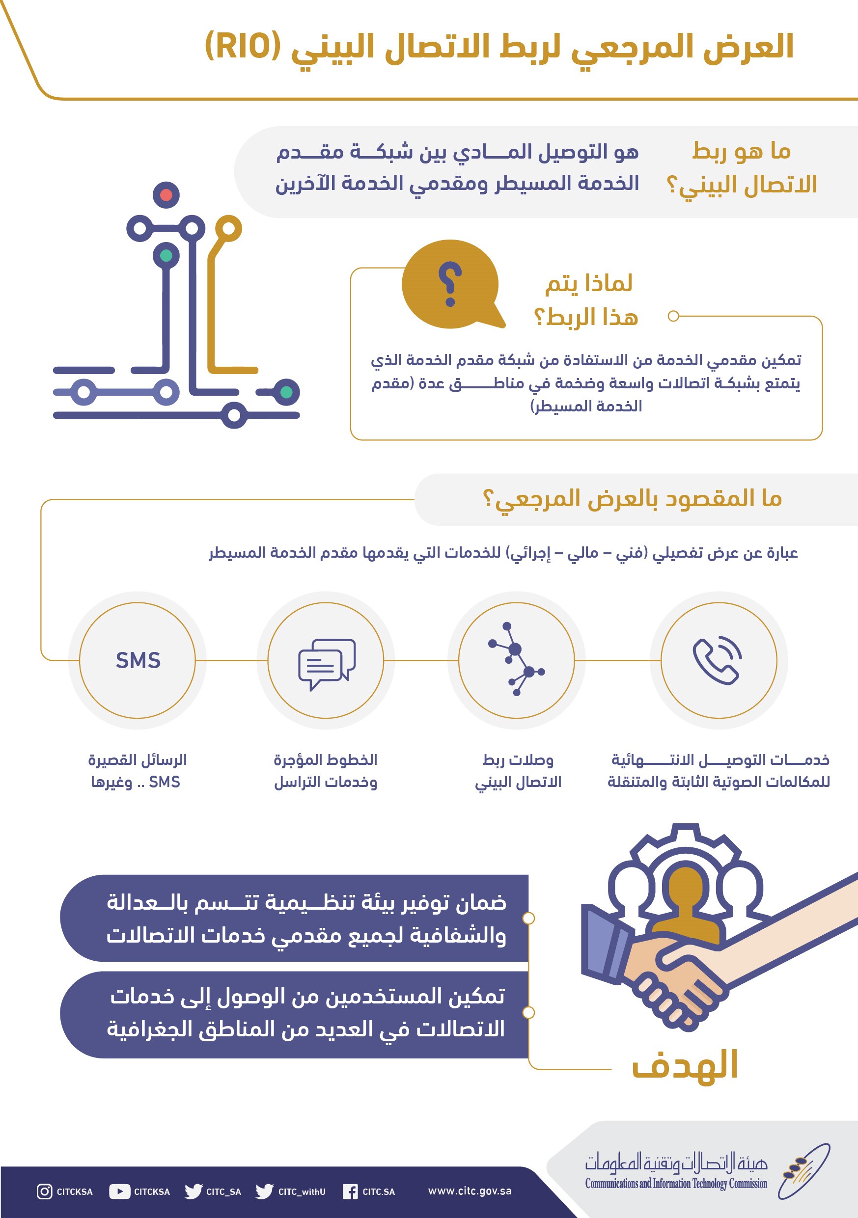اعتمدت هيئة الاتصالات وتقنية المعلومات وثيقة محدثة للعرض المرجعي لربط الاتصال البيني (RIO) المقدمة من شركة الاتصالات السعودية والتي تعنى بتنظيم خدمات البيع بالجملة الخاصة بمقدم الخدمة الذي يتمتع بشبكة اتصالات واسعة وضخمة في مناطق عدة (مقدم الخدمة المسيطر) مع شبكات مقدمي خدمة الاتصالات الآخرين؛ وذلك بهدف ضمان توفير بيئة تنظيمية تتسم بالعدالة والشفافية لجميع مقدمي خدمات الاتصالات.