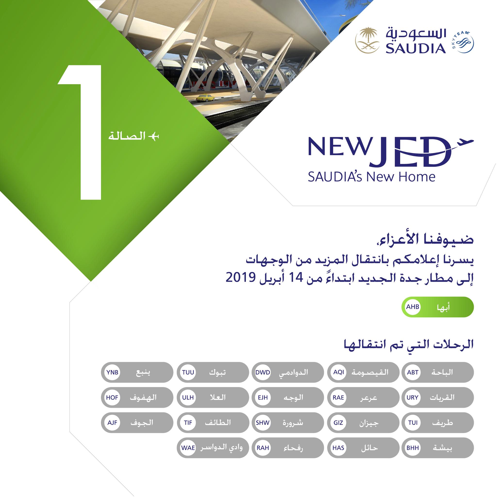 بدأت الخطوط السعودية اعتبارا من اليوم الأحد 14 ابريل 2019م تشغيل جميع رحلات القدوم والمغادرة بين جدة وأبها عبر الصالة الجديدة في مطار الملك عبدالعزيز الدولي بجدة، وذلك في إطار الانتقال التدريجي لتشغيل رحلات الناقل الوطني إلى (صالة 1) ، وبذلك تتم “السعودية” المرحلة الثانية من خطة عملية الانتقال التدريجي التي تتم الأخرى في المطار الحالي، وذلك بالتنسيق والتعاون مع الهيئة العامة للطيران المدني وإدارة مطار الملك عبدالعزيز الدولي بجدة .
