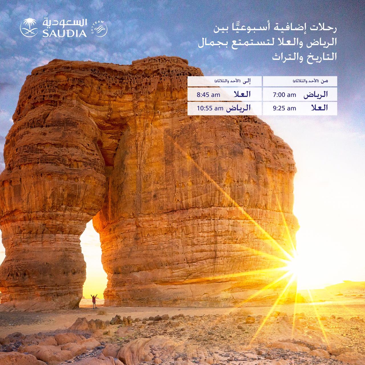 أضافت الخطوط السعودية رحلتين جديدتين بين الرياض والعلا لتلبية الطلب المتزايد للسفر إلى محافظة العلا، التي تشهد نموًا متسارعًا كوجهة سياحية ومركز ثقافي وتراثي يحظى بإقبال كبير من السياح من داخل المملكة وخارجها، إضافةً إلى ما تشهده من مشروعات تنموية جديدة تهدف إلى تطوير هذه المنطقة واستثمار مقوماتها الطبيعية والتاريخية لتنمية السياحة التراثية والثقافية في المحافظة.