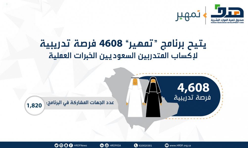 كشف صندوق تنمية الموارد البشرية “هدف”، عن توفر 4608 فرصة تدريبية لخريجي وخريجات الجامعات من حملة درجة البكالوريوس فأعلى ضمن برنامج التدريب على رأس العمل “تمهير”، داعيًا الخريجين والخريجات للاستفادة من تلك الفرص، واكتساب الخبرات والمهارات اللازمة المطلوبة لسوق العمل من خلال التدريب العملي في مواقع العمل الفعلية وفقًا لتخصصاتهم.