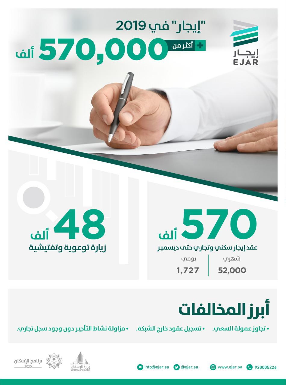 كشف برنامج “إيجار” التابع لوزارة الإسكان عن توثيق نحو 570 ألف عقد إيجار سكني وتجاري في الشبكة الإلكترونية لخدمات الإيجار، فيما بلغ المعدل اليومي لتوثيق العقود في الشبكة خلال الفترة الماضية 1727 عقد إيجاري ومعدل 52 ألف عقد شهري.