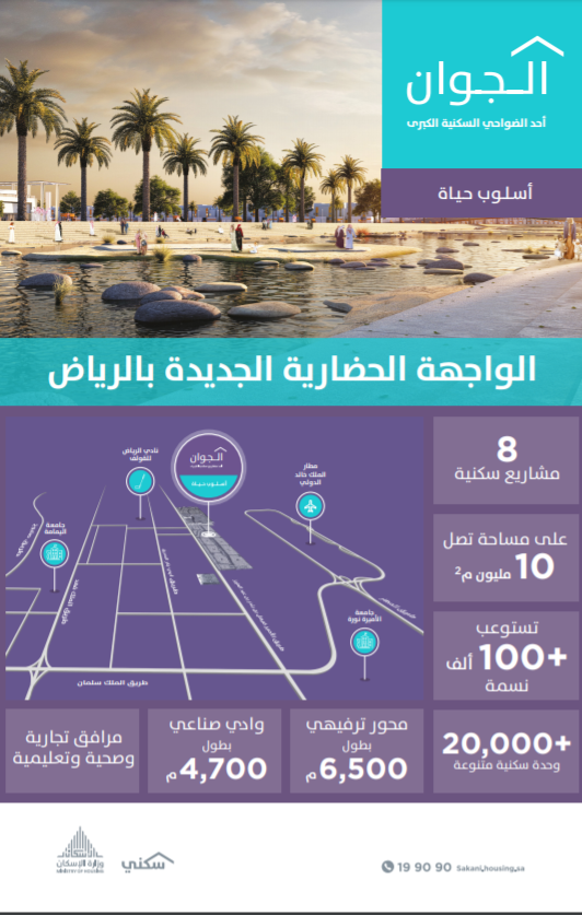 ومن المقرر أن توفّر ضاحية الجوان أكثر من 20 ألف وحدة سكنية متنوعة ما بين شقة وفيلا وتاون هاوس، من خلال 8 مشاريع ينفذها القطاع الخاص منها 7 متاحة للحجز الإلكتروني من قبل المستفيدين لتستوعب أكثر من 100 ألف نسمة، ضمن بيئة سكنية متكاملة الخدمات والمرافق بأسلوب حياة عصري يضمن لهم مجتمع حيوي ومزدهر يُمكن الأسرة السعودية من ممارسة نشاطاتها مـن تعليم وصحة وتسوق وترفيه ورياضة بكل يسر وسهولة وأمان.