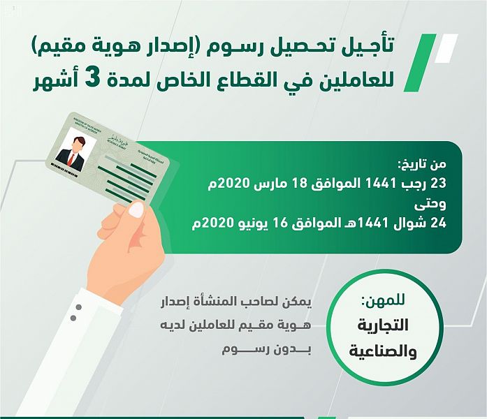أعلنت المديرية العامة للجوازات بالتعاون مع مركز المعلومات الوطني، عن تأجيل تحصيل رسوم “إصدار هوية مقيم” للعاملين في المهن التجارية والصناعية في القطاع الخاص، والمستحقة على المنشآت لمدة ثلاثة أشهر من تاريخ 1441/7/23هـ الموافق 2020/3/18م حتى تاريخ 1441/10/24هـ الموافق 2020/6/16م.