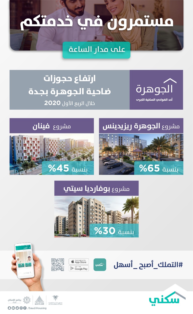 وأوضح برنامج “سكني” في بيانٍ صحافي اليوم، أن مشاريع ضاحية الجوهرة الواقعة شمال محافظة جدة سجلت نسب حجوزات عالية للوحدات السكنية تجاوزت نحو 65% لمشروع “الجوهرة ريزيدنس” أحد مشاريع الضاحية، وأكثر من 45% لمشروع فينان، فيما سجل مشروع “بوفارديا سيتي” نسبة حجوزات تجاوزت 30%