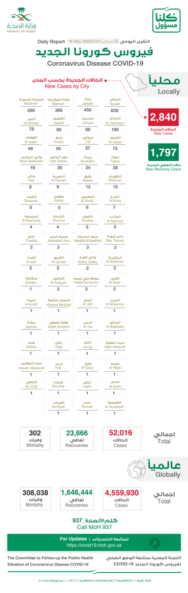 وأشار إلى أن ما يخص المملكة فيضاف للعدد الإجمالي العدد الجديد من الحالات المؤكدة وهي (2840) حالة، حيث توزعت في عدد من المدن وهي: الرياض (839) حالة، وجدة (450) حالة، ومكة المكرمة (366)حالة، والمدينة المنورة (290) حالة، والدمام (180) حالة، والدرعية (89) حالة، والقطيف (80) حالة، والخبر (78) حالة، والجبيل(75) حالة، والطائف (57) حالة، وينبع (50) حالة، والهفوف (49) حالة، وتبوك (38) حالة، وبريدة (24) حالة، وحفر الباطن (20) حالة، ووادي الدواسر(19) حالة، والظهران (15) حالة، وبقيق (13) حالة، والنعيرية (9) حالات، وحائل (8) حالات، والخرج (7) حالات، والخفجي (6) حالات، وصفوى (5) حالات، وشقراء (5) حالات، والمذنب (5) حالات، وخليص (5) حالات، والخرمة (4) حالات، والمجمعة (4) حالات، ورأس تنورة (3) حالات، ومنفذ الحديثة (3) حالات، وجديدة عرعر (3) حالات، وثادق (3) حالات، والبكيرية حالتان، ووادي الفرع حالتان، والقريع حالتان، والليث حالتان، والقرى حالتان، وحوطة بني تميم حالتان، والسليل حالتان، وحالة واحدة في كل من سكاكا، وعنيزة، والمبرز، والجفر، وخميس مشيط، والبدائع، والرس، وعقلة الصقور، وبيشة، وسبت العلايا، وأملج، وحقل، وضباء، والوجه، والقوز، وعرعر، وحزم الجلاميد، والدلم، وليلى، وضرماء، والزلفي، والقويعية، ورماح، والقريات, وبالتالي يصبح عدد الحالات المؤكدة في المملكة (52016) حالة، ومن بين هذه الحالات يوجد حالياً (28048) حالة نشطة لاتزال تتلقى الرعاية الطبية لأوضاعها الصحية، ومعظمهم حالتهم الصحية مطمئنة، منها (166) حالة حرجة، والبقية حالاتها مطمئنة.