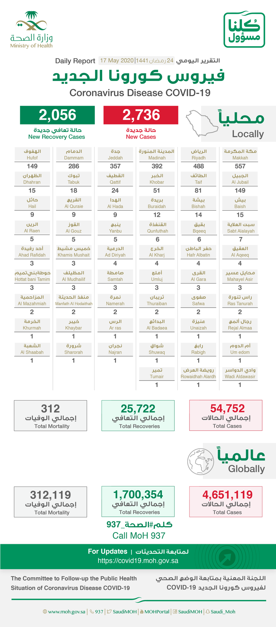 كشفت وزارة الصحة السعودية اليوم الاحد 17 مايو 2020، عن تسجيل 2736 حالة إصابة جديدة بفيروس كورونا الجديد (كوفيد19)، خلال يوم أمس السبت.