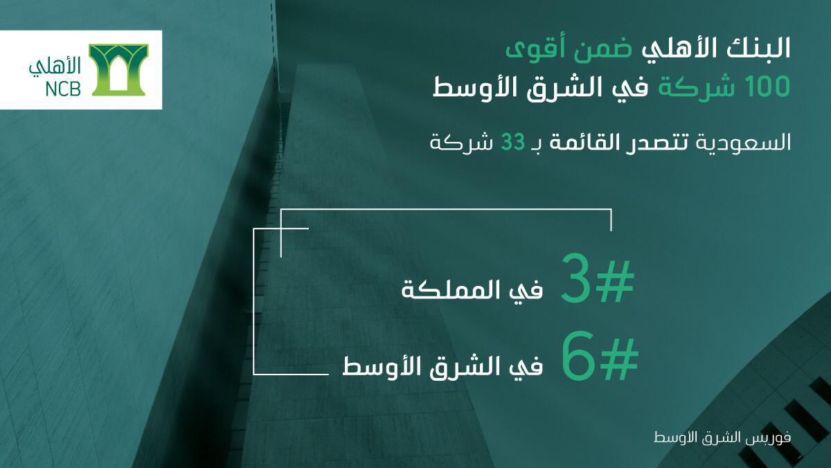 في تأكيد جديد على قوة مركزه المالي على كافة المستويات وطنياً وإقليمياً ودولياً، صُنف البنك الأهلي ضمن قائمة فوربس لأقوى 100 شركة في الشرق الأوسط وقائمة فوربس لأقوى 40 شركة عربية في العالم لعام 2020 متصدراً بذلك البنوك السعودية، ليحتل المرتبة السادسة على مستوى منطقة الشرق الأوسط والثالثة على مستوى المملكة، استنادًا إلى 4 معايير: المبيعات والأرباح والأصول والقيمة السوقية والتي تعتبر من أهم معايير قياس قوة المراكز المالية.