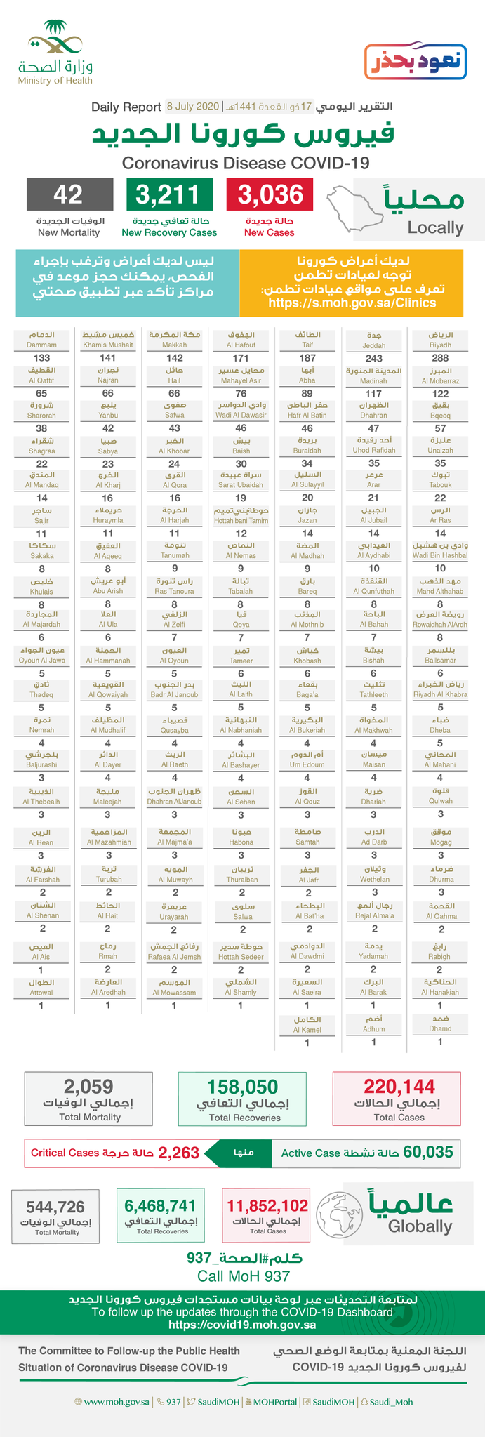 أعلنت وزارة الصحة، اليوم الاربعاء 08 يوليو 2020، تسجيل 3036حالة إصابة جديدة بفيروس كورونا الجديد (كوفيد-19) ليصبح الإجمالي 220144حالة .
