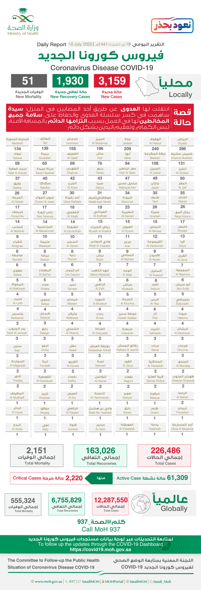 أعلنت وزارة الصحة، اليوم الجمعة 10يوليو 2020، تسجيل 3159 حالة إصابة جديدة بفيروس كورونا الجديد (كوفيد-19) ليصبح 226486الإجمالي حالة .