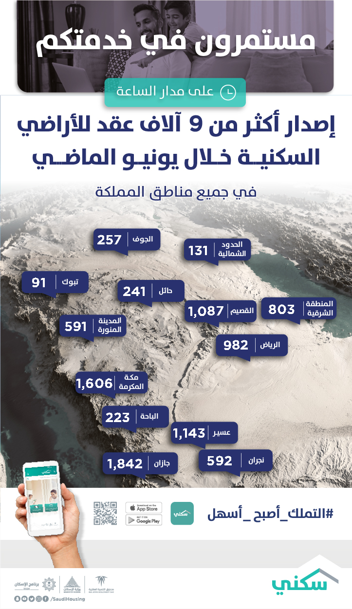 أصدر برنامج “سكني” التابع لوزارة الإسكان 9589 عقد لأراضٍ سكنية للمستفيدين من البرنامج خلال شهر يونيو الماضي، وذلك ضمن خياراته المتنوعة لتمكين الأسر السعودية من التملّك ورفع نسبته إلى 70% تماشياً مع مستهدفات برنامج الإسكان – أحد برامج رؤية المملكة 2030 -.