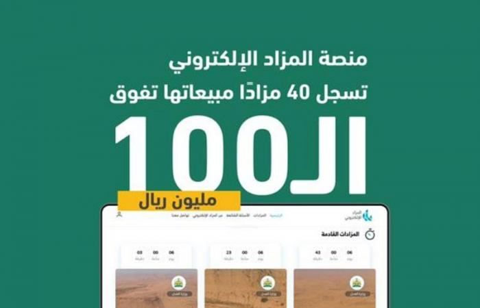 سجلت منصة المزاد الإلكتروني التي تمكن المستفيدين من المشاركة في المزادات القضائية إلكترونياً، مبيعات وصلت إلى 100 مليون ريال، إذ بلغ عدد المزادات المطروحة 40 مزاداً، فيما بلغ عدد المزايدين المسجلين في المنصة أكثر من خمسة آلاف مزايد.