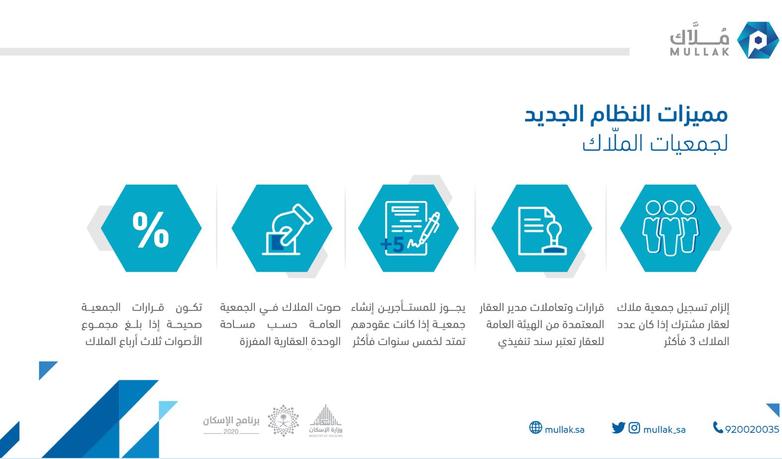 يُذكر أن نظام “مُلّاك” الجديد يُتيح فرص عمل مُستحدثة في السوق العقاري، مثل (مدراء عقارات)، ويؤكد على أهمية دور الوسطاء العقاريين في تيسير بيع الوحدات العقارية ذات الملكية المشتركة؛ كما يسهم في دعم المنظومة العقارية عبر رفع مستوى الشفافية بين المُلاك، وزيادة موثوقية الأعمال التي تتم في الجمعيات، ويمكن الاطلاع على النظام ولائحته، والتسجيل في “مُلّاك” عبر الموقع الإلكترونيhttps://mullak.housing.gov.sa / .