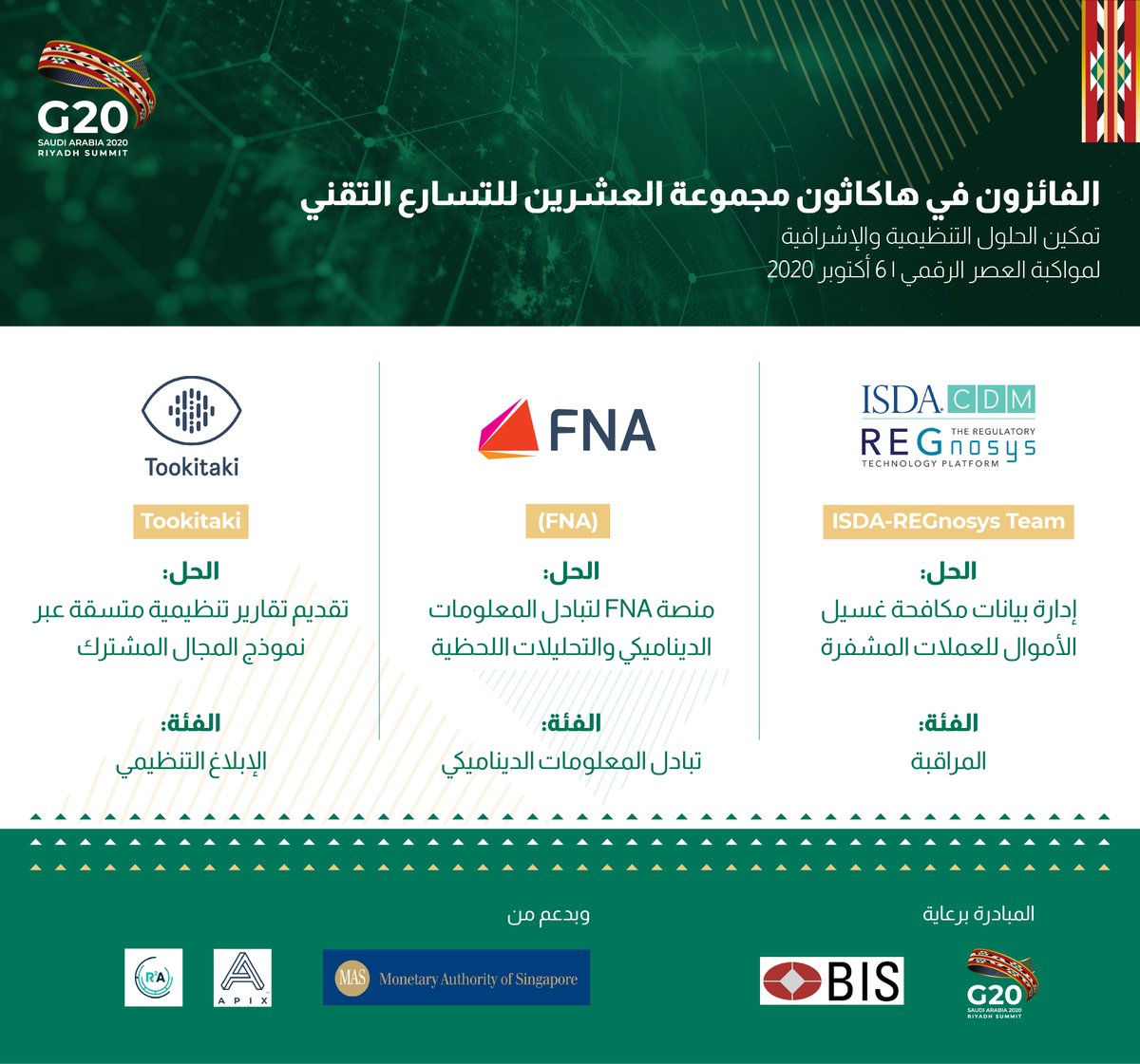 أعلنت مجموعة العشرين في السعودية ومركز الابتكار التابع لبنك التسويات الدولية يعلنان عن الفائزين في هاكاثون مجموعة العشرين للتسارع التقني G20TechSprint، وفي فئة المراقبة فاز isda- reGnosys team الحل: إدارة بيانات مكافحة غسيل الأموال للعملات المشفرة – وفي فئة المعلومات الديناميكي فازت منصة FNA لتبادل المعلومات الديناميكي والتحليلات اللحظية، وفي فئة الابداع التنظيمي فاز Tookitaki الحل: تقديم تقارير تنظيمية منسقة عبر نموذج المجال المشترك.