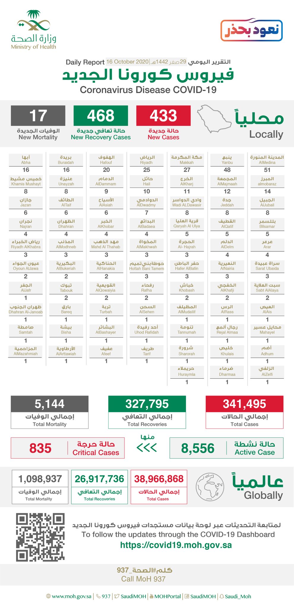 وقالت الصحة إنه تم تسجيل (17) حالات وفيات رحمهم الله، وتسجيل (468) حالة تعافي ليصبح إجمالي عدد الحالات المتعافية (327,795) حالة ولله الحمد.