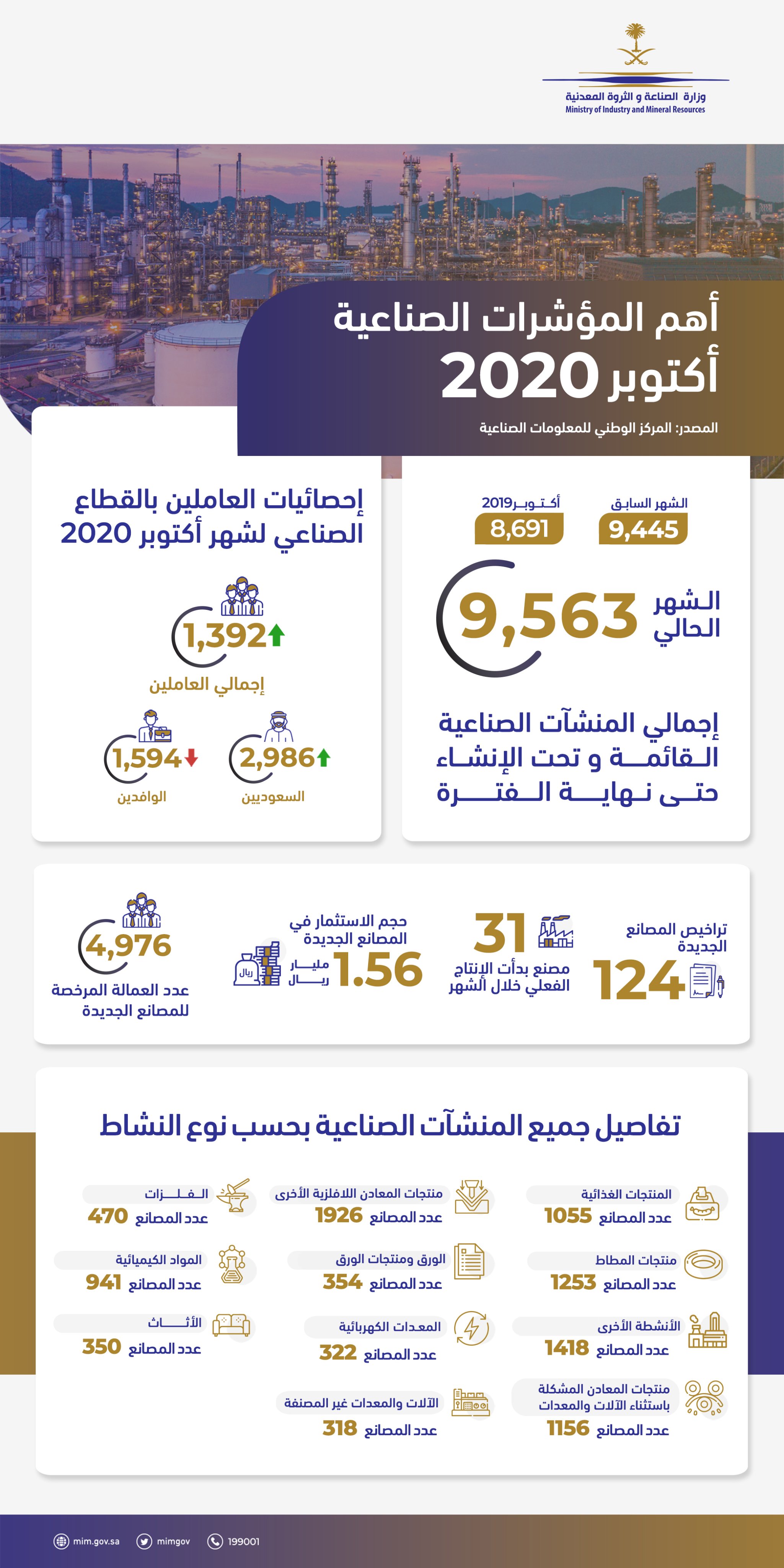 وبينت الوزارة عبر تقريرها الشهري للمؤشرات أن إجمالي المنشآت الصناعية القائمة وتحت الإنشاء حتى نهاية أكتوبر ارتفع ليصل إلى 9,563 منشأة.