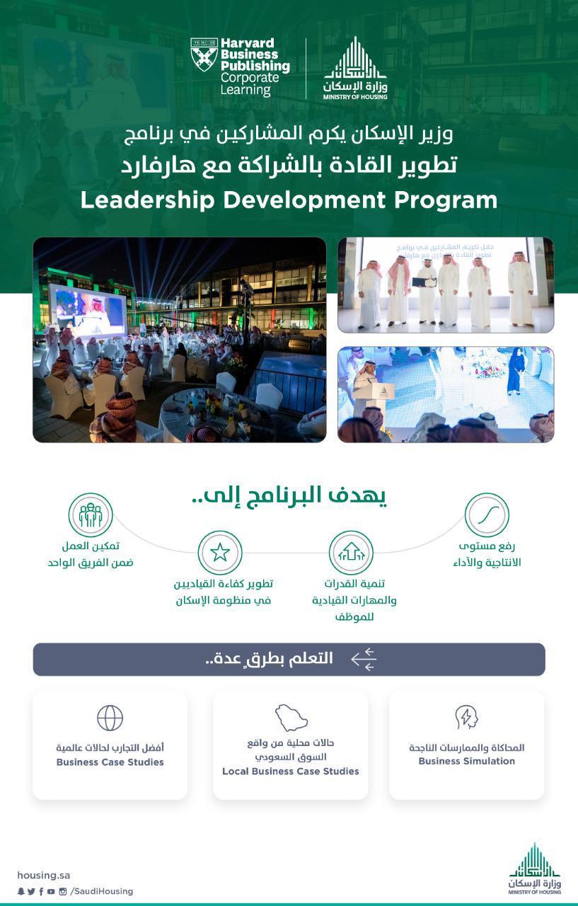احتفلت وزارة الإسكان اليوم باجتياز الدفعة الأولى من برنامج “تطوير القادة” التدريبي الذي عقد بالتعاون مع “هارفارد للأعمال” لتأهيل القيادات التنفيذية ومدراء الإدارات في منظومة الإسكان، وذلك بحضور معالي وزير الإسكان وزير الشؤون البلدية والقروية المُكلف ماجد بن عبدالله الحقيل.