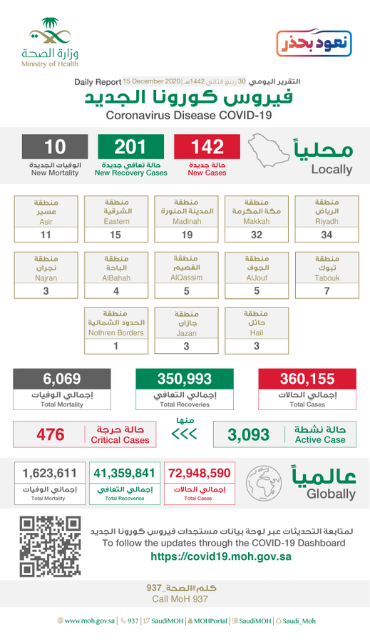 أعلنت وزارة الصحة اليوم تسجيل (142) حالة مؤكدة جديدة لفيروس كورونا الجديد (COVID -19) ليصبح عدد الحالات المؤكدة في المملكة (360155) حالة، من بينها (3093) حالة نشطة لاتزال تتلقى الرعاية الطبية، ومعظمهم حالتهم الصحية مطمئنة، منها (476) حالة حرجة، كما تم تسجيل (201) حالة تعافٍ جديدة، ليصل عدد المتعافين ولله الحمد إلى (350993) حالة, وبلغ عدد الوفيات (6069)حالة، بإضافة (10) حالات وفاة جديدة, لافتةً النظر إلى أنه تم إجراء (34552) فحصاً مخبرياً جديداً.