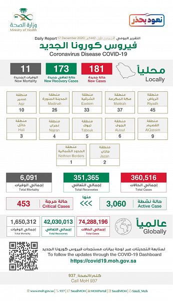 أعلنت وزارة الصحة اليوم تسجيل (181) حالة مؤكدة جديدة لفيروس كورونا الجديد (COVID -19) ليصبح عدد الحالات المؤكدة في المملكة (360516) حالة، من بينها (3060) حالة نشطة لاتزال تتلقى الرعاية الطبية، ومعظمهم حالتهم الصحية مطمئنة، منها (453) حالة حرجة، كما تم تسجيل (173) حالة تعافٍ جديدة، ليصل عدد المتعافين ولله الحمد إلى (351365) حالة، وبلغ عدد الوفيات (6091)حالة ، بإضافة (11) حالة وفاة جديدة، لافتةً النظر إلى أنه أجري (39441) فحصاً مخبرياً جديداً.