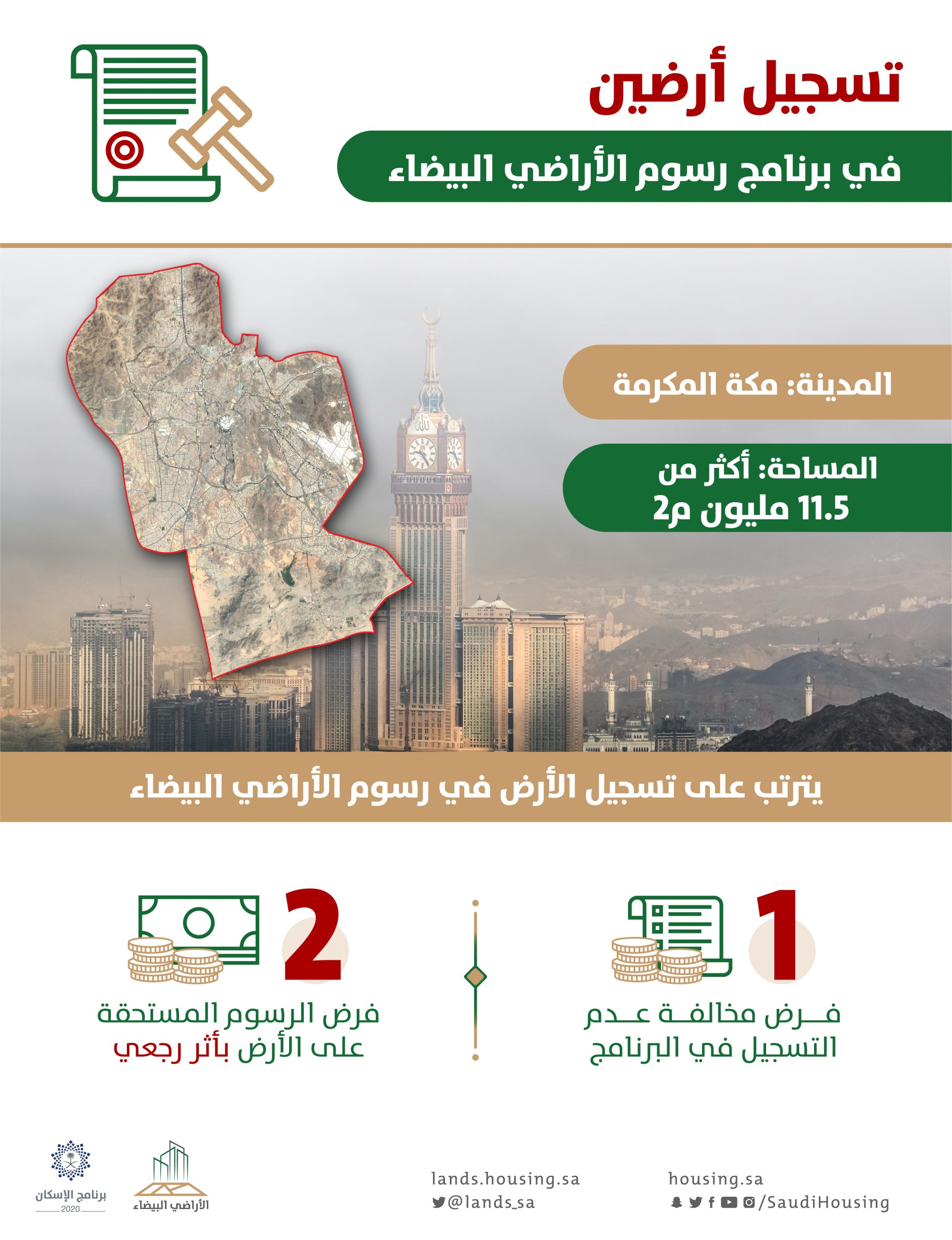 أعلن برنامج “الأراضي البيضاء” عن تسجيله أرضين في مكة المكرمة بمساحة إجمالية بلغت 11,5 مليون م2 بعد رصد عدم تسجيلها في النظام، ضمن المرحلة الأولى التي تُعنى بالأراضي غير المطورة “الخام” بمساحة 10 آلاف م2 وأكثر، والواقعة ضمن النطاق المُعلن عنه في المدن التي تم تطبيق النظام فيها.
