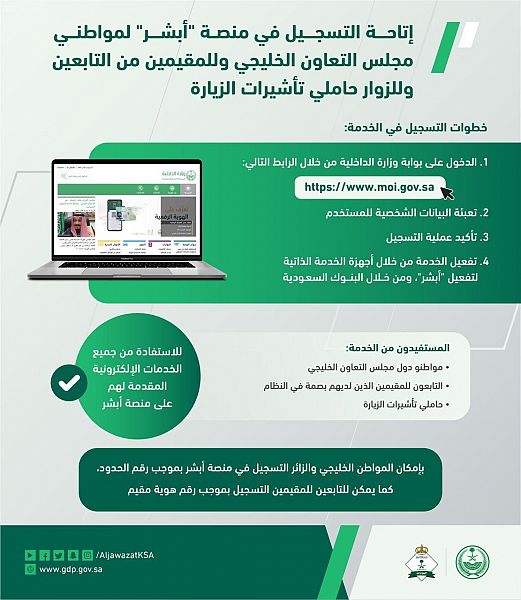 أتاحت المديرية العامة للجوازات لمواطني دول مجلس التعاون الخليجي، وللمقيمين من التابعين، وللزوار حاملي تأشيرة الزيارة، الاستفادة من الخدمات المقدمة إلكترونياً من وزارة الداخلية عبر منصة “أبشر” للخدمات الإلكترونية، وذلك بالتعاون مع مركز المعلومات الوطني.