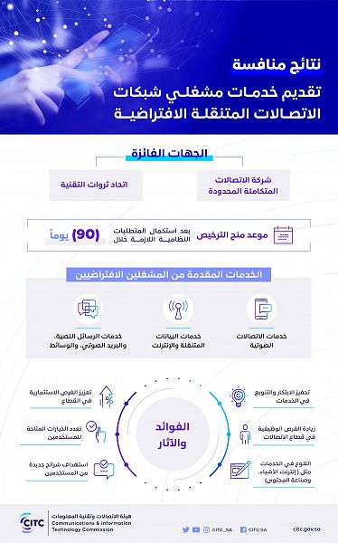 أعلنت هيئة الاتصالات وتقنية المعلومات اليوم، نتائج منافسة تقديم خدمات مشغلي شبكات الاتصالات المتنقلة الافتراضية (MVNO) التي أسفرت عن فوز كل من: شركة الاتصالات المتكاملة المحدودة، واتحاد ثروات التقنية بالمنافسة، ومنحهما (90) يومًا من تاريخ إبلاغهم بالفوز؛ لاستكمال المتطلبات النظامية اللازمة، مشددةً على أن عدم استيفاء إحدى الشركتين الفائزتين لتلك المتطلبات خلال المهلة المحددة سينتج عنه اختيار المرشح الثالث كبديل، على أن تطبق عليه الإجراءات النظامية نفسها حسب ما ورد في وثيقة طلب الحصول على الترخيص.