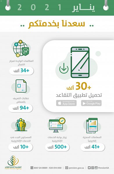 كما أشارت الإحصائية إلى زيادة عدد المسجلين الجدد في بوابة الخدمات الإلكترونية إلى أكثر من 10 آلاف مسجل جديد، وبلوغ عدد مرات تحميل تطبيق التقاعد إلى أكثر من 30 ألف تحميل في المتجرين قوقل بلاي وأبل ستور، فيما بلغ عدد خطابات التعريف بالمعاش المصدرة أكثر من 94 ألف تعريف، وارتفع عدد البطاقات التقاعدية الإلكترونية المصدرة عبر البوابة والتطبيق إلى أكثر من 33 ألف بطاقة، كما تم إنجاز أكثر من 41 ألف معاملة تقاعدية وصرف أكثر من 6،7 مليارات ريال سعودي كمعاشات تقاعدية للمتقاعدين والمستفيدين في الشهر ذاته.
