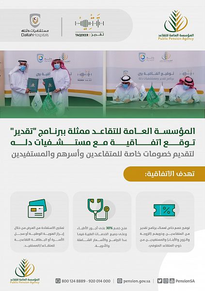 وقعت المؤسسة العامة للتقاعد ممثلة ببرنامج “تقدير” وشركة دلّة للخدمات الصحية اليوم مذكرة تفاهم لمنح المتقاعدين والمستفيدين خصومات على الخدمات الطبية التي تقدمها “دلة الصحية”.