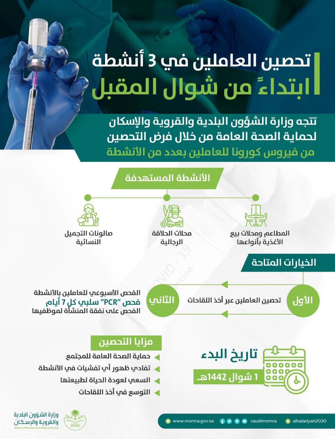 أقرت وزارة الشؤون البلدية والقروية والإسكان، اشتراط تحصين جميع العاملين في المطاعم والمقاهي، ومنافذ بيع الأطعمة، إضافة إلى العاملين في محلات الحلاقة الرجالية وصالونات التجميل النسائية، بلقاح فيروس كورونا، أو وجود نتيجة فحص “PCR” سلبية كل 7 أيام، على أن يبدأ سريان العمل بهذا القرار في 1 شوال القادم.