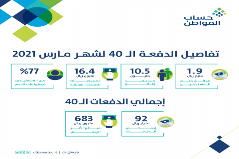 أودع برنامج حساب المواطن اليوم الأربعاء 1.9 مليار ريال مخصص دعم شهر مارس للمستفيدين المكتملة طلباتهم، حيث بلغ عدد المستفيدين المستوفين لمعايير الاستحقاق في الدفعة الأربعين 10.5 مليون مستفيد وتابع، وبلغ إجمالي التعويضات المدفوعة بأثر رجعي عن الدفعة السابقة 16.4 مليون ريال، ليصبح إجمالي ما دفعـه البرنامـج للمستفيدين منذ انطلاقته حوالي من 92 مليار ريال منها 683 مليـون ريال تعويضات عن دفعـات سابقة.