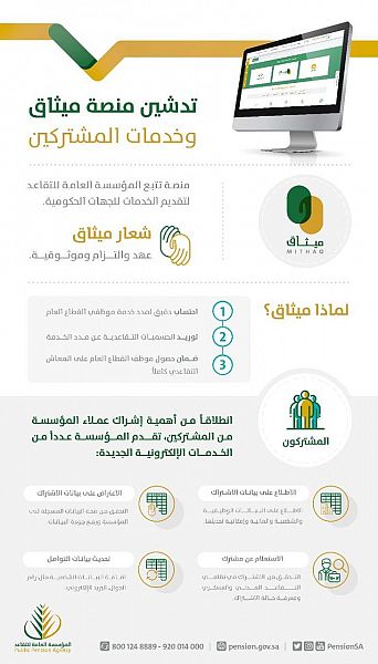 تجدر الإشارة إلى أن تدشين منصة “ميثاق” جاء تنفيذاً للأمر السامي الكريم، حيث أن المنصة هي إحدى مبادرات المؤسسة لتنفيذ خطتها الإستراتيجية 2023 وبناء قاعدة بيانات خاصة بالمشتركين بما يسهم في تحسين الأداء، وبما يعود بالنفع على موظفي القطاع العام أثناء الخدمة وبعد التقاعد.