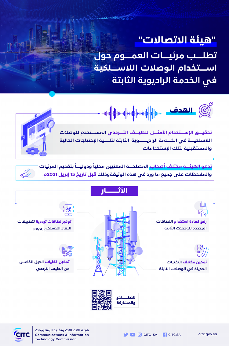 وأوضحت الهيئة أنها تسعى لتخطيط وإعادة ترتيب ترددات النطاقات المستخدمة للوصلات الثابتة؛ بهدف رفع كفاءة استخدام الترددات لهذه النطاقات، وتمكين أحدث التقنيات لها، بما يدعم ويعزز من أداء شبكات الجيل الخامس في المملكة, بالإضافة إلى دراسة توفير الاحتياجات الحالية والمستقبلية لشبكات النفاذ اللاسلكية الثابتة (FWA) من الطيف الترددي بما يحقق الاستخدام الأمثل لهذا المورد الطبيعي المحدود وبما يتوافق مع احتياجات المستخدمين الحالية والمستقبلية.